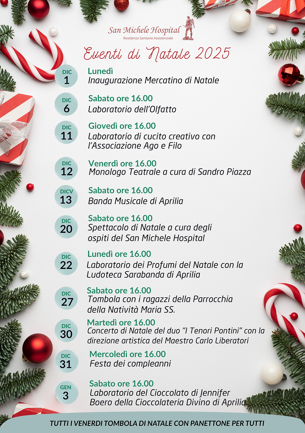 E come ogni anno, tutti i venerdì si terrà la tradizionale Tombola di Natale, accompagnata da un panettone per tutti gli ospiti.